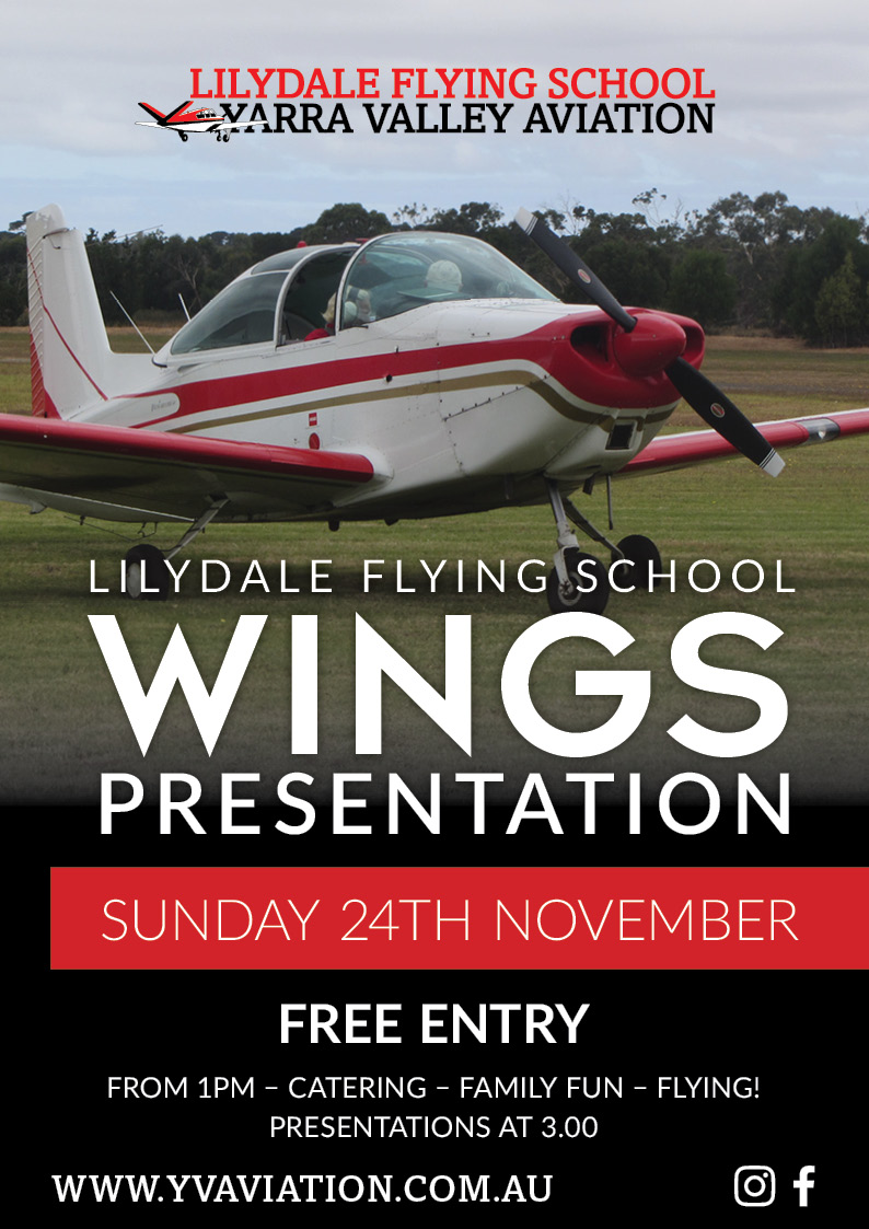 We're rushing towards our premiere event of the year, our annual WINGS awards.  This is where we celebrate the achievements of the pilots that choose to learn with us, that's you!  We also have a number of prestigious and valuable scholarships that will be presented on the day, as well as some flying activities to enjoy.  There's no charge to attend, it's our pleasure to have you along. Join the Yarra Valley Aviation team on Sunday 24th November for an afternoon of presentations, family friendly social gathering and flying.